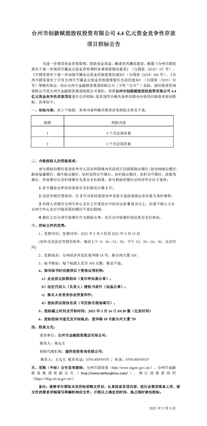 臺(tái)州市創(chuàng)新賦能股權(quán)投資有限公司4.4億元資金競(jìng)爭(zhēng)性存放項(xiàng)目招標(biāo)公告