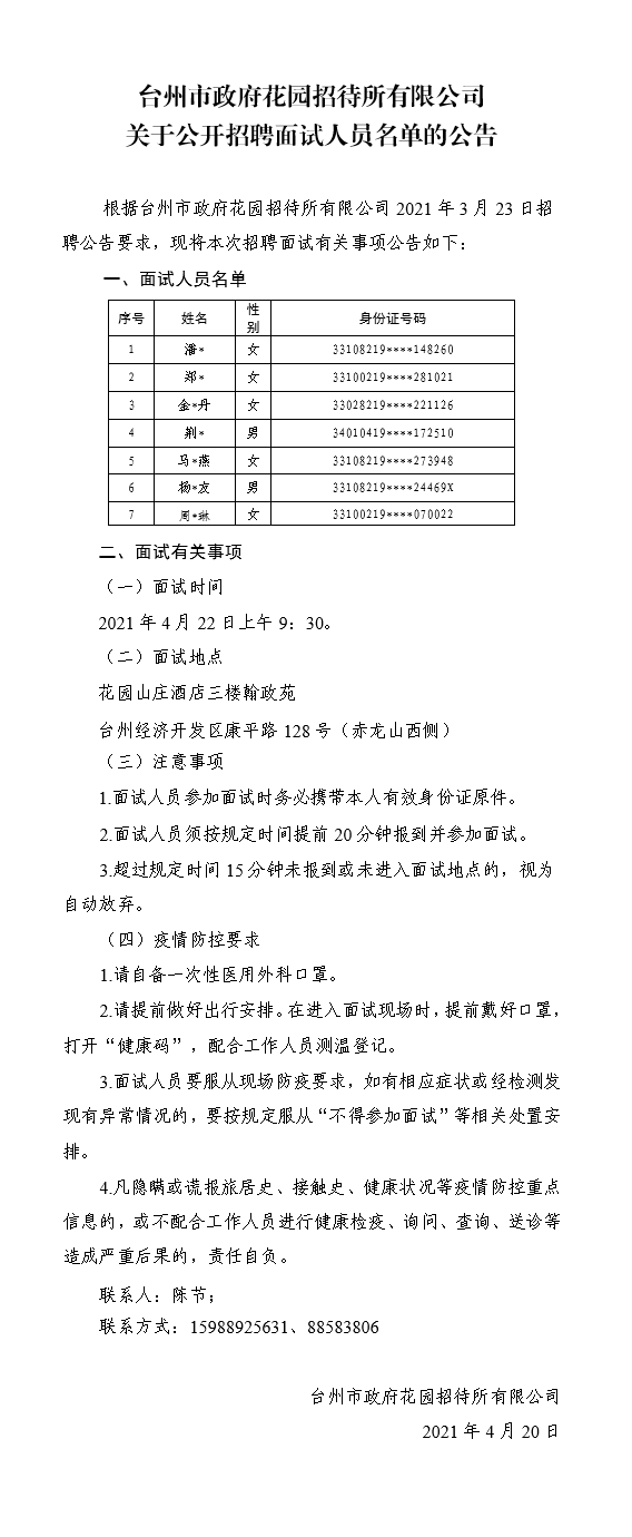 臺(tái)州市政府花園招待所有限公司關(guān)于公開招聘面試人員名單的公告