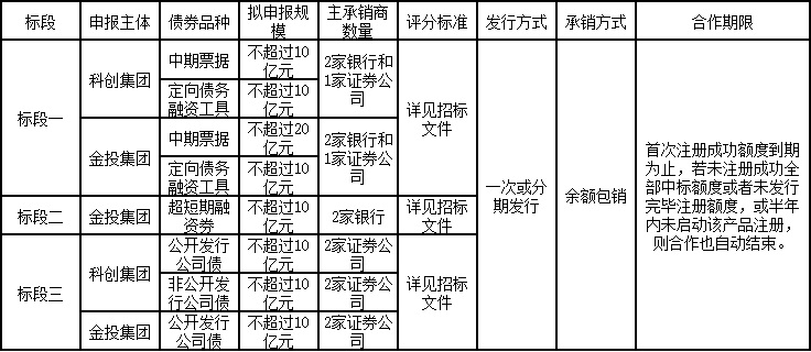 發(fā)行債券主體為科創(chuàng)集團(tuán)和金投集團(tuán)。共分為三個(gè)標(biāo)段,通過(guò)公開(kāi)招投標(biāo)形式評(píng)選承銷商,總共采購(gòu)6家銀行,6-8家證券公司,標(biāo)段一共計(jì)采購(gòu)4家銀行和2家證券公司,標(biāo)段二共計(jì)采購(gòu)2家銀行,標(biāo)段三共計(jì)采購(gòu)6家證券公司,具體見(jiàn)下表:
