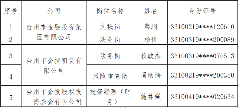 根據(jù)臺州市金融投資集團有限公司2022年9月1日公開招聘公告要求,經(jīng)公開報名、筆試、面試、體檢和考察等程序,確定以下人員為擬錄用人員,現(xiàn)公示如下:
